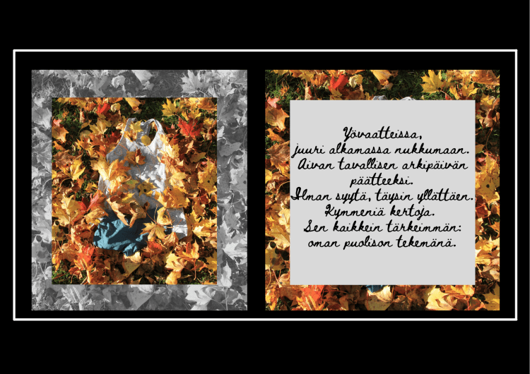 ”Olin kavereiden kanssa viettämässä aikaa. Kesken puskapissareissun tuntematon aikuinen mies hyökkäsi kimppuuni. Olin 14-vuotias. Takkini on siellä kai vieläkin.”