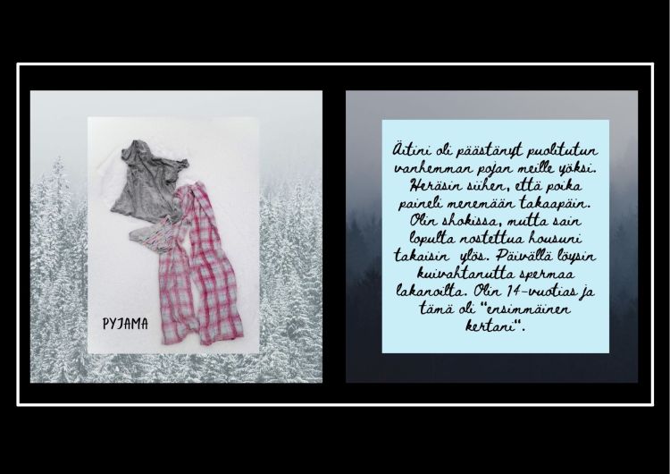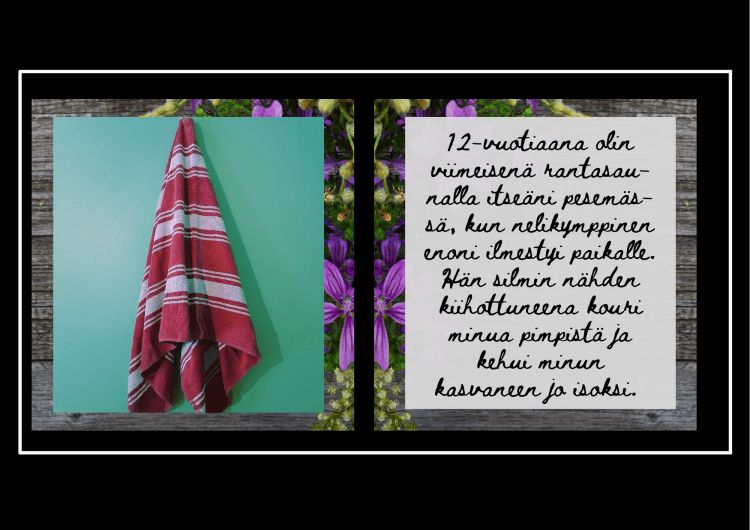 ”12-vuotiaana olin viimeisenä rantasaunalla itseäni pesemässä, kun nelikymppinen enoni ilmestyi paikalle. Hän silmin nähden kiihottuneena kouri minua pimpistä ja kehui minun kasvaneen jo isoksi.”