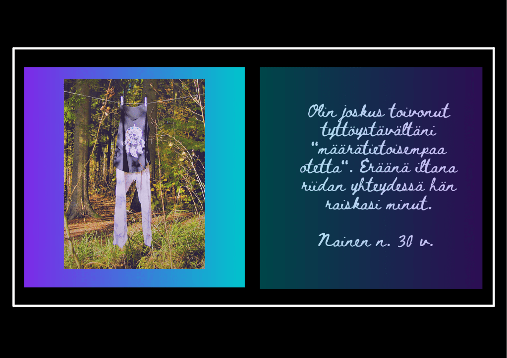 ”Olin joskus toivonut tyttöystävältäni ´määrätietoisempaa otetta´. Eräänä iltana riidan yhteydessä hän raiskasi minut.” Nainen n. 30 v.